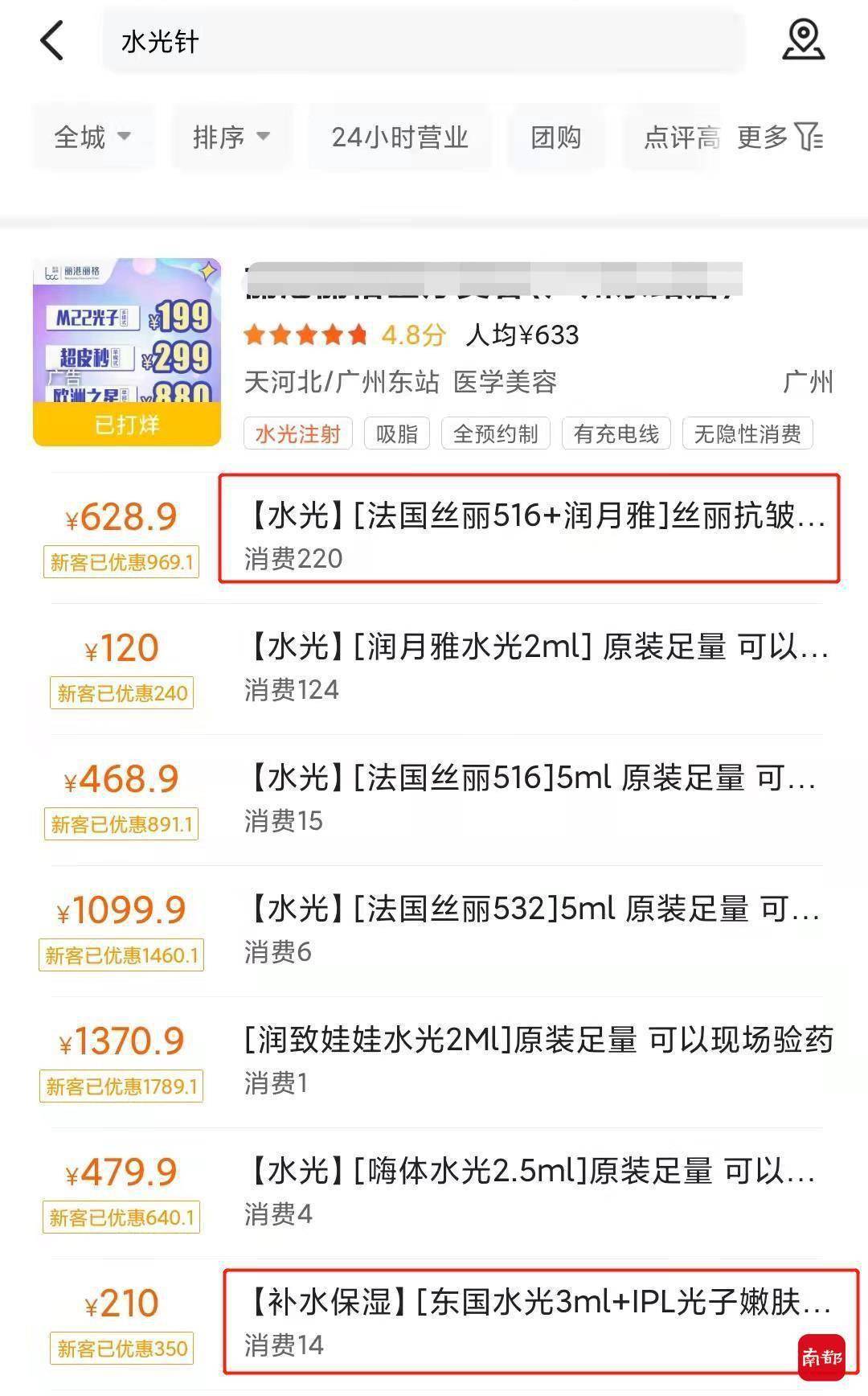 某团搜索水光针,弹出“东国”“丝丽”等多个品牌。