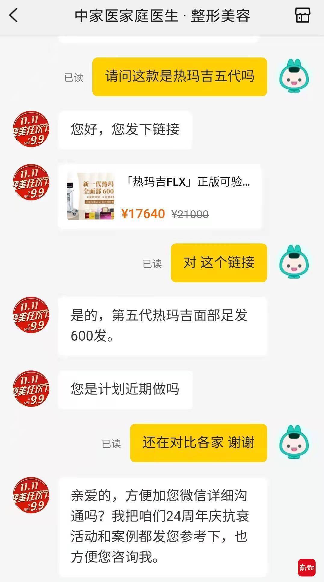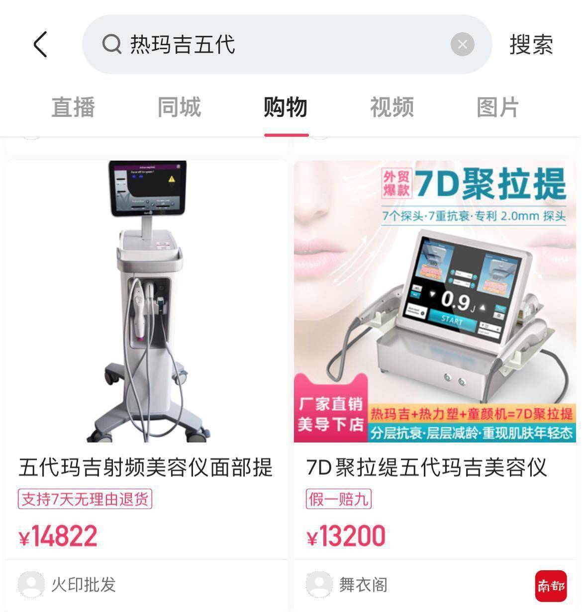 近日,南都记者在某团、某音、小某书等多个社交电商平台,以“医美”“热玛吉五代”“水光针”等关键词进行搜索,发现部分平台在售“新一代热玛吉”,经过在线沟通核实上述产品即“热玛吉五代”。