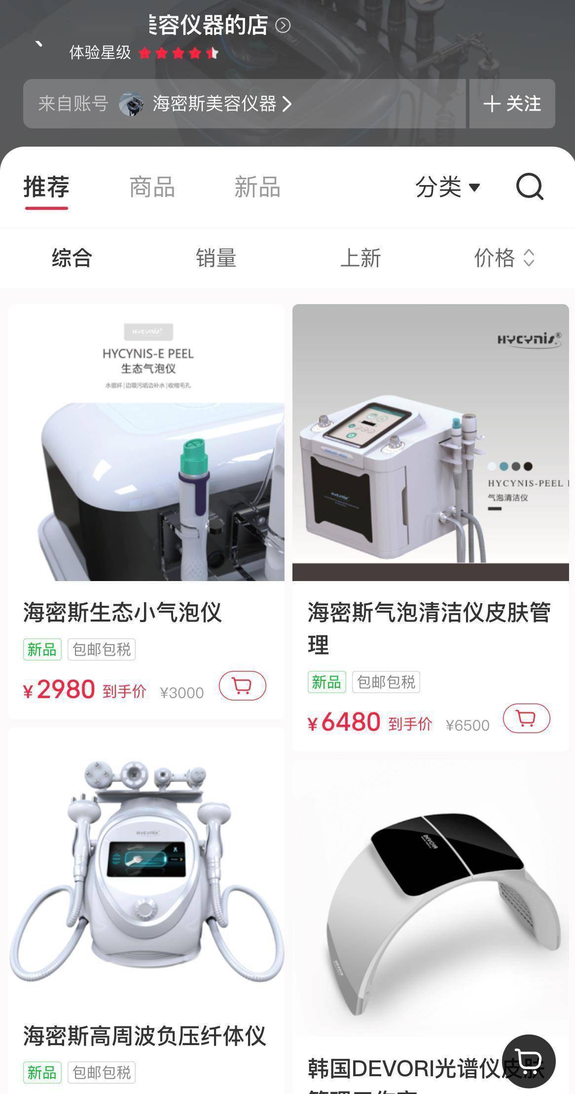 在小某书搜索“水光针”“高周波”和“热玛吉”商品,出现2400+篇“高周波”相关笔记,仅一家店铺销售,店铺名称为“海密斯美容仪器的店”,商品名为“海密斯高周波负压纤体仪”,产品介绍除了价格和几张产品图、效果图,找不到其他关于资质、检测报告等内容。店铺主营小气泡仪、光谱仪、负离子蒸汽喷雾机等各类美容医疗器械。