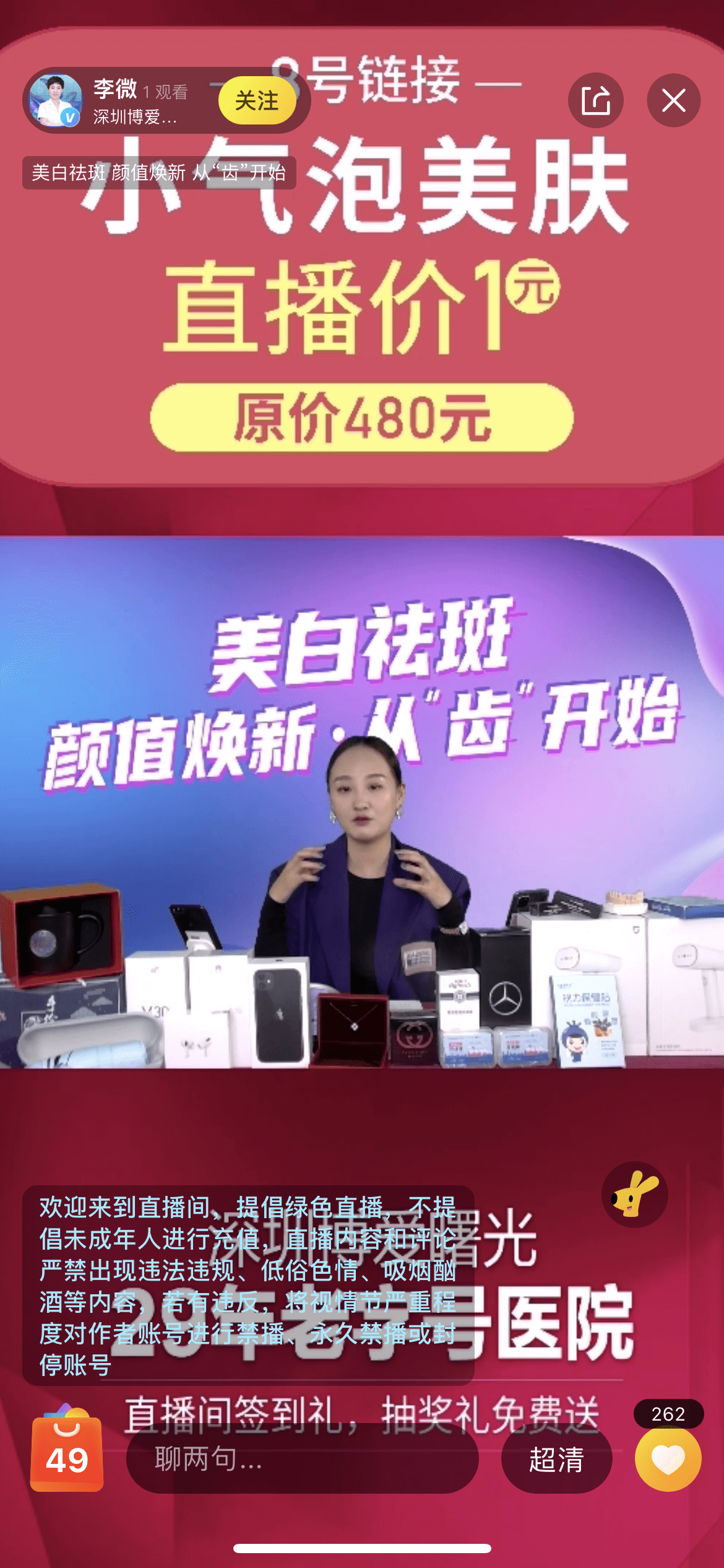 也有部分主播在评论区互动被问到医美项目时,反复提及平台监管严格,不能频繁出现相关字眼,有需要私聊主播了解详情。部分直播间挂出“一元钱做护理”“9.9元体验皮肤清洁”等广告项目,引导顾客私聊和到店体验。