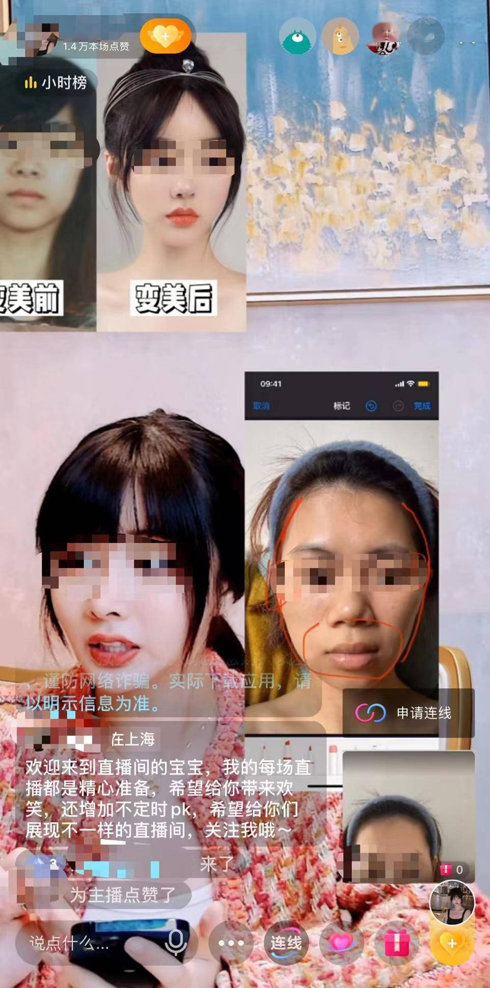 随机点开一个直播间,画面显示主播整容前后的对比图,主播对着一张图详细解析面容比例,分享自己是如何通过医美一步步变美,话题引起评论区观众围观咨询,该场直播观看量1.4万多。