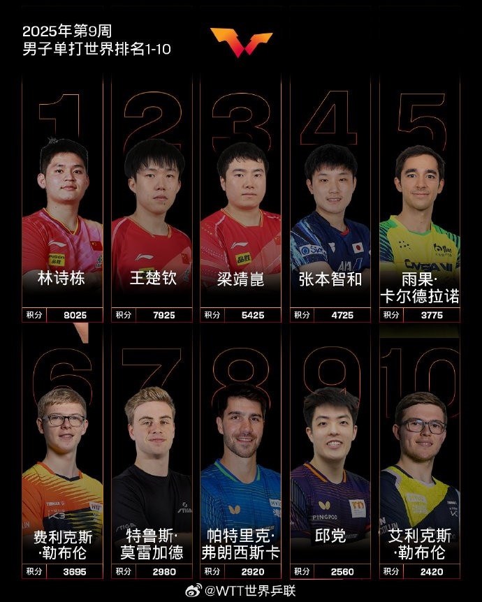 男单方面,林诗栋8025分保持排名第一,王楚钦7925分排名第二,梁靖崑 5425分排名第三,林高远排名第11。